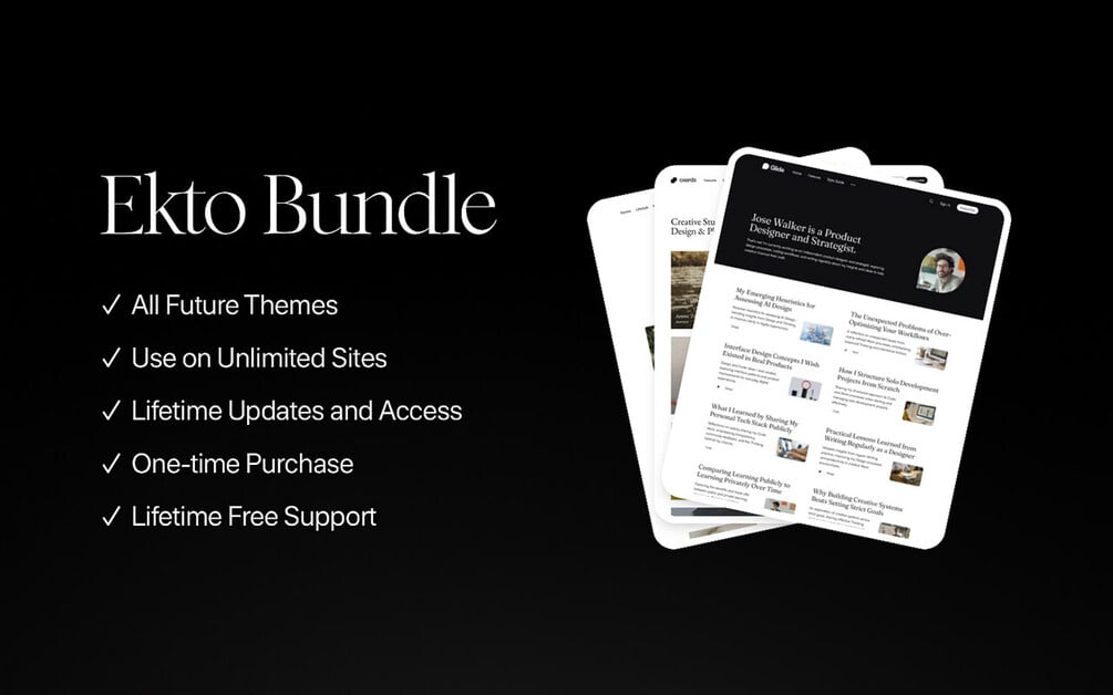 The Bundle gives you lifetime access to all current and future themes, unlimited usage on any number of websites, and lifetime updates to keep your themes fresh and up-to-date.